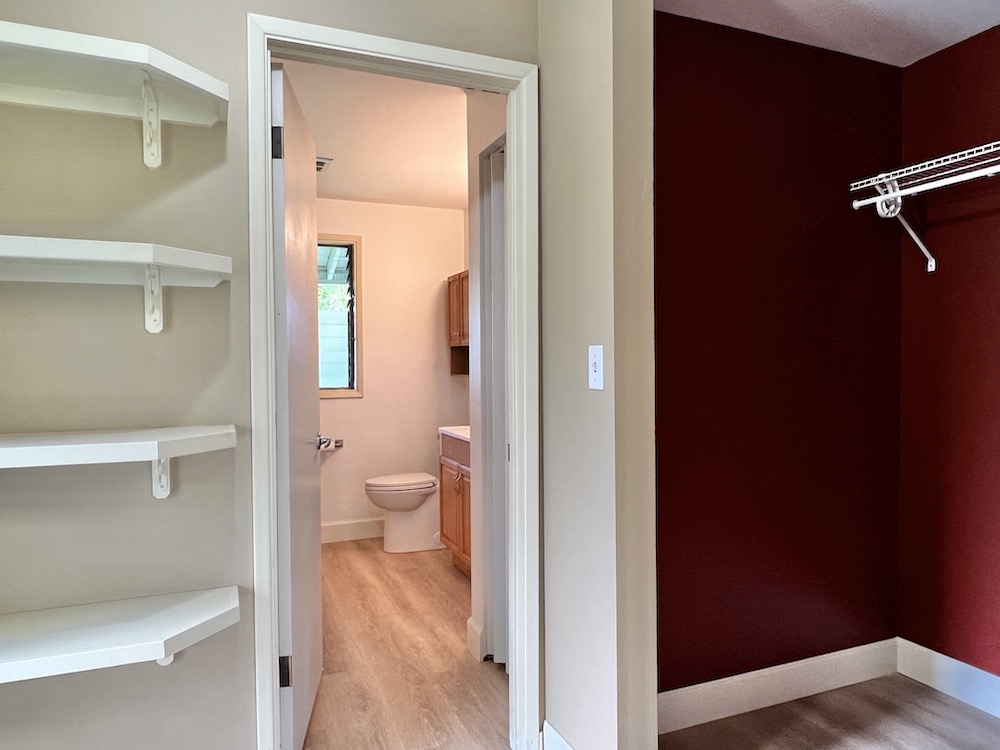 The bedroom is separated by shoji doors and is bright and airy. There’s a walk-in closet off the bedroom that leads to the bathroom which also houses the washer and dryer. Access to the complex’s pool is an added bonus.